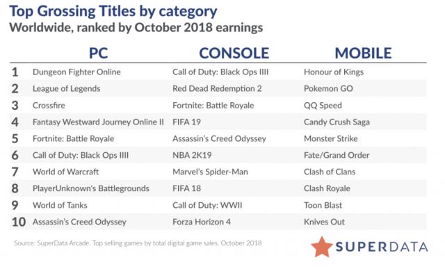 Ниже представлены списки самых успешных игр на РС, консолях и мобильных устройствах в октябре этого года по версии SuperData.