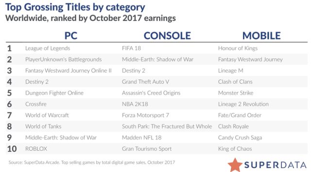 Ниже представлены списки 10 самых успешных цифровых игр для РС, консолей и мобильных устройств за октябрь этого года по данным SuperData: