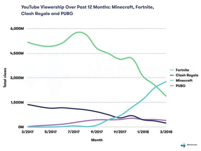 Что касается просмотров роликов, то по данным аналитиков, Fortnite уже обошёл Minecraft. Как видно на представленном графике, просмотры роликов про Minecraft снижаются с августа 2017 года.