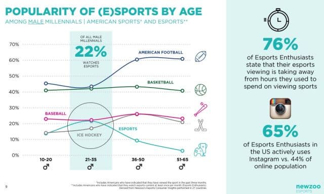 Согласно новому отчёту аналитической компании Newzoo молодые американцы в возрасте от 21 до 35 лет смотрят кибер-спортивные соревнования также часто как хоккей или бейсбол. Причём 22% людей из данной категории причисляются к фанатам того или иного вида спорта. Это важная группа людей для различных рекламодателей, которые готовы тратить серьёзные деньги для продвижения своих товаров среди молодых людей.