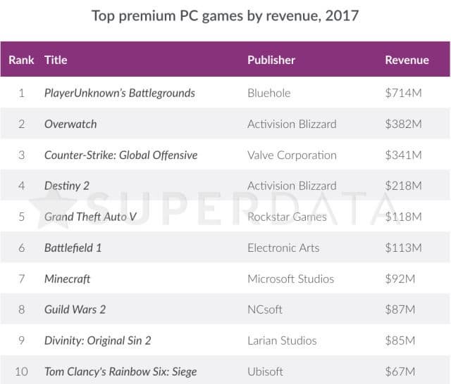 Аналитическая компания SuperData Research опубликовала информацию о цифровых продажах за 2017 год. По данным аналитиков, сетевой боевик PlayerUnknown's Battlegrounds за восемь месяцев пребывания на рынке принёс 714 миллионов долларов дохода. В списке самых успешных «премиальных» игр для РС за прошлый год PlayerUnknownBattlegrounds уверено удерживает лидерство, опережая Overwatch на 332 миллиона долларов. Напоминаем, что SuperData учитывает только цифровые продажи.