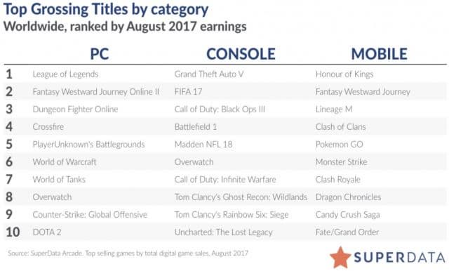 Ниже представлены списки из 10 самых успешных игр на РС, консолях и мобильных устройствах. Компания SuperData учитывает только цифровые продажи.