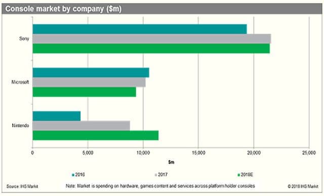 По данным IHS Markit, общий доход от игр, консолей и сервисов Xbox в 2017 году превысил 10 миллиардов долларов. На продукты Nintendo пользователи потратили около 8 миллиардов долларов. В 2016 году на продукты Nintendo было потрачено примерно 4 миллиарда долларов. Столь значительный рост обусловлен запуском консоли Switch, а также продажами 3DS и выходом SNES Classic.