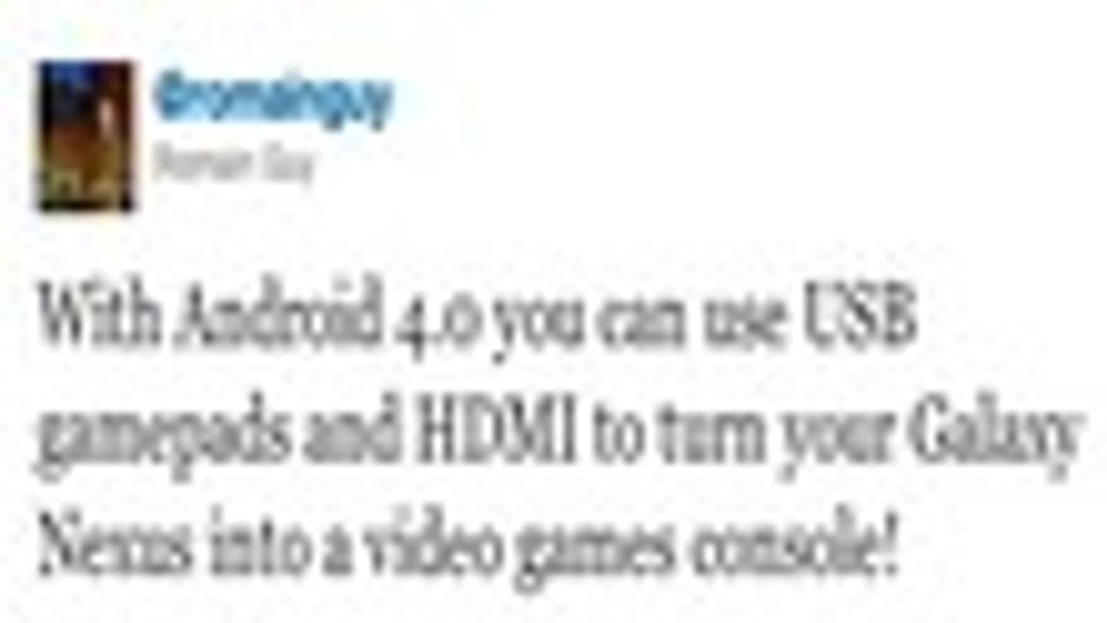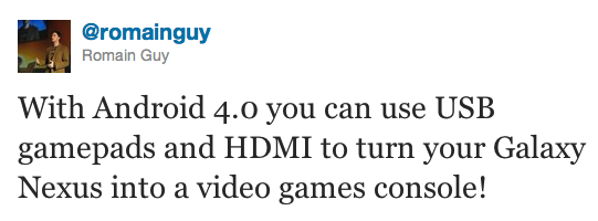На twitter-страничке разработчика из Google Ромейна Гая (Romain Guy) была опубликована информация о том, что в версии Android 4.0 будет реализована поддержка игровых USB-устройств.