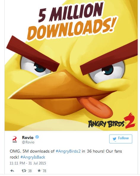 На официальной twitter-страничке Rovio была опубликована инормация о том, что в течение первых 36 часов после релиза Angry Birds 2 игру скачали уже более 5 млн раз.