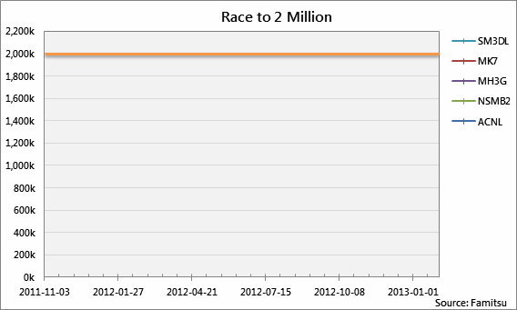 Animal Crossing: New Leaf за считанные недели обошла такие популярные хиты, как Mario 3D Land, Mario Kart 7, Monster Hunter 3G и New Super Mario Bros. 2. Источник добавляет, что Animal Crossing: New Leaf превзошла достижение самой успешной PS3-игры в Японии, Final Fantasy 13, продажи которой составляют 1,9 млн. копий. Что касается самого лучшего результата, независимо от платформы, то он принадлежит игре New Super Mario Bros. Wii, продажи которой на территории Страны Восходящего солнца составляют 4,4 млн. копий.