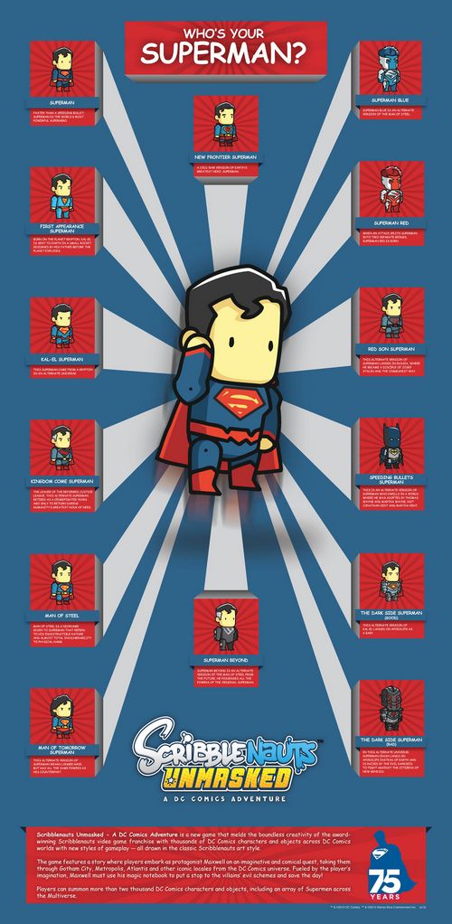 Scribblenauts Unmasked - A DC Comics Adventure позволит игрокам использовать для решения возникающих проблем тысячи персонажей и предметов из комиксов DC. В игре будет 14 версий только одного лишь Superman'а, включая Classic Superman, Red Son Superman, Kingdom Come Superman, Speeding Bullets Superman и так далее.