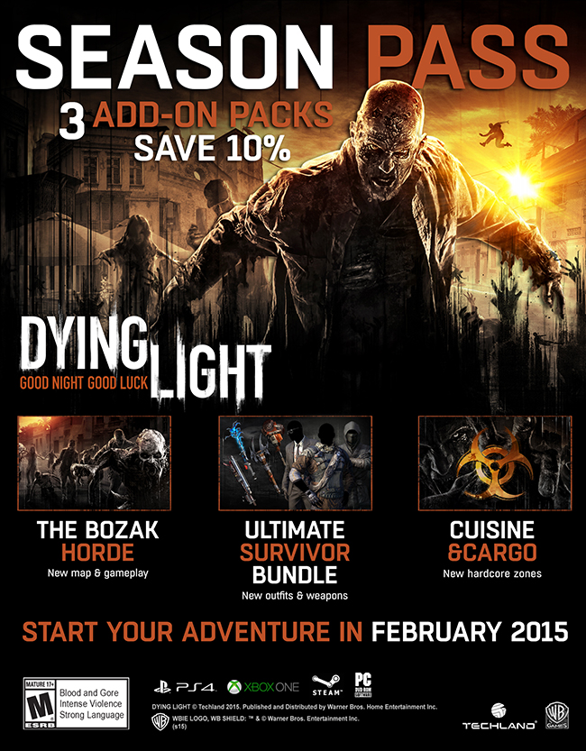 Компания Techland опубликовала информацию о том, какие дополнения для зомби-экшена Dying Light будут выпущены после релиза игры, а также анонсировала сезонный пропуск, предоставляющий доступ к DLC за $19,99.