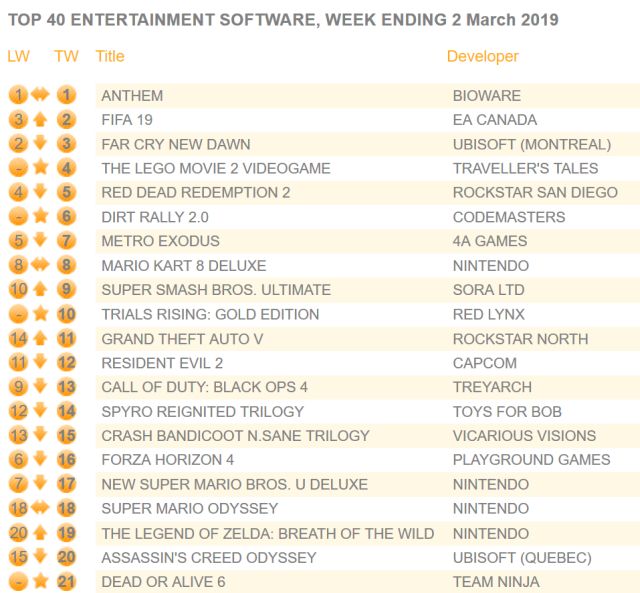 В условиях отсутствия новых громких и успешных релизов на первом месте остался проект Anthem от BioWare, продажи которого снизились на 71% по сравнению с предыдущей неделей. На второе место поднялся футбольный симулятора FIFA 19, обойдя Far Cry: New Dawn.