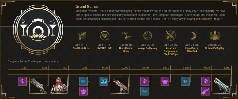 Respawn Entertainment с 14 по 28 января проведёт событие в стиле 20-х годов XX века «Званый вечер» в Apex Legends. Игроки смогут принять участие в семи временных игровых режимах, сменяющих друг друга каждые два дня.