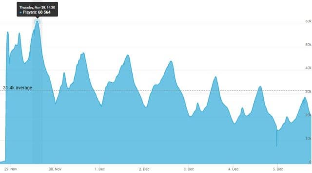 30 ноября пиковой цифрой стало 47 459. В последующие пять дней цифра продолжила уменьшаться. 5 декабря максимальное количество одновременных игроков составило 28 477 человек. Однако есть и положительный момент – оценка игры выросла на 3 пункта.