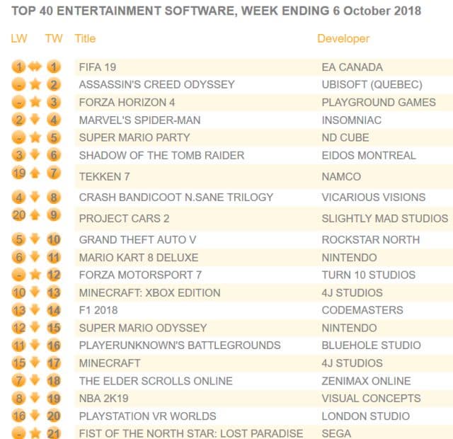 Spider-Man опустился со второй на четвертую строчку. На пятом месте стартовал сборник мини-игр Super Mario Party для Swicth. Боевик First of the North Star: Lost Paradise для PS4 добрался до 21-го места.