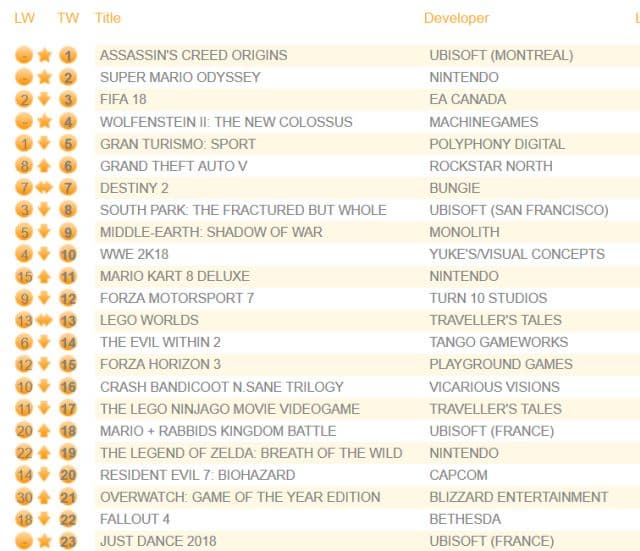 Just Dance 2018 стартовала на 23-м месте. Игра лучше всего продаётся на Wii и Switch.