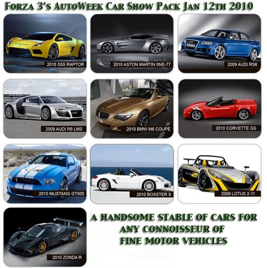 Вчера, 12 января 2010 поклонники гоночной игры Forza Motorsport 3 получили возможность приобрести новое дополнение под названием Autoweek Car Show Pack, которое появилось в Xbox Live Marketplace по цене 400 MSP.
