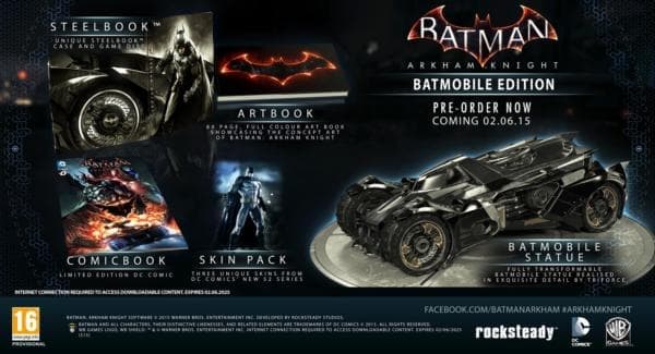 Также были анонсированы два коллекционных издания. Batman: Arkham Knight - Batmobile Edition будет предлагаться по цене $199,99, в его состав войдут: