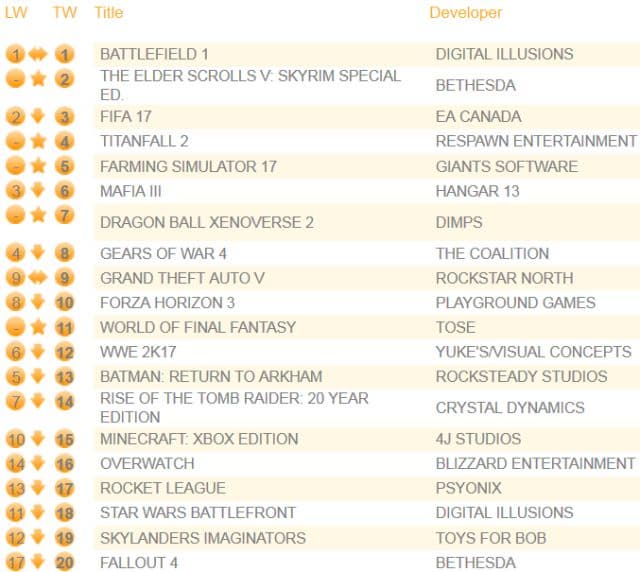 С четвертой строчки стартовал Titanfall 2. Вслед за ним расположился симулятор фермера Farming Simulator 17. На седьмой строчке дебютировал файтинг Dragon Ball Xenoverse 2. Японская ролевая игра World of Final Fantasy стартовала с 11 строчки. Just Dance 2017 оказался на 26 месте списка.