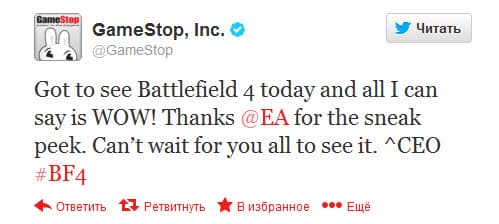 Исполнительный директор торговой сети GameStop Пол Райнс (Paul Raines) на своей twitter-страничке заявил, что он побывал на закрытой презентации Battlefield 4 и остался под впечатлением от увиденного.