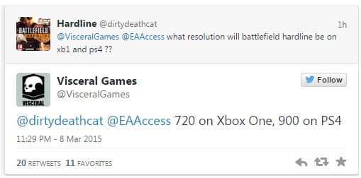 На официальной twitter-страничке Visceral Games была опубликована информация о том, что шутер от первого лица Battlefield: Hardline будет работать в разрешении 900р и 720р на PS4 и Xbox One, соответственно.