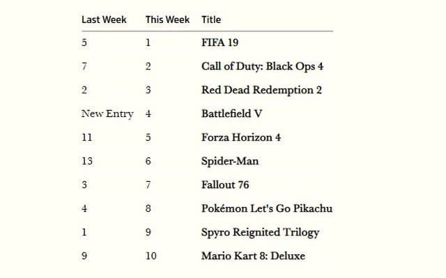 Начало продаж Battlefield V пришлось на неделю «Чёрной Пятницы». Однако сетевой боевик уступил не только продававшимся со скидками FIFA 19 и Call of Duty: Black Ops IIII, но и Red Dead Redemption 2. Поэтому только четвёртая позиция. Напомним, что британский топ включает только физические продажи.
