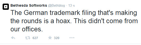 Чуть позже на официальной twitter-страничке было опубликовано опровержение данной информации. Представители Bethesda Softworks заявили, что это обычный слух, а также, что компания не имеет никакого отношения к регистрации данной торговой марки.