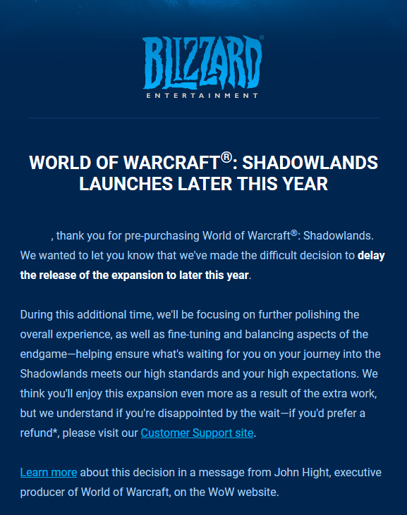 Тем временем, некоторые пользователи получили письмо от Blizzard с уведомлением о задержке релиза Shadowlands. В письме также отмечается, что компания понимает разочарование игроков и готова вернуть деньги за предварительный заказ дополнения.