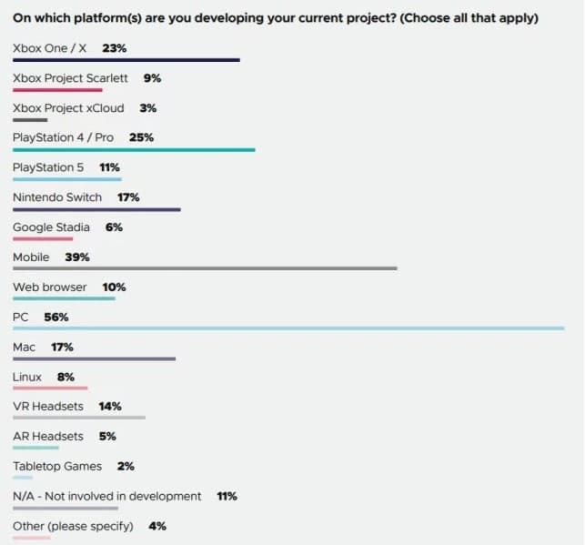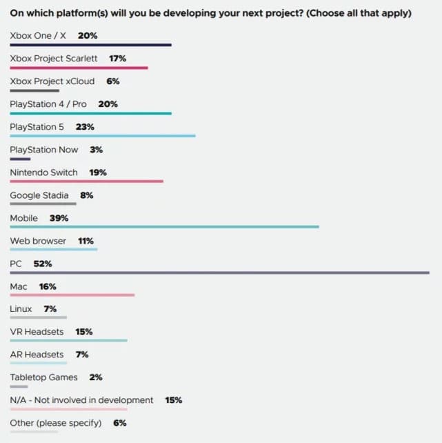 Опрос показал, что самой популярной платформой среди разработчиков остается PC – более 50%. На втором месте – мобильные устройства с 39% голосов. Третья позиция за PlayStation 4 – 25%. Что касается консолей следующего поколения, игры на PlayStation 5 сейчас делают 11% респондентов, а на новую Xbox – 9%.