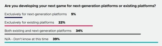 5% опрошенных создают эксклюзивы для консолей следующего поколения, а 22% - эксклюзивы для нынешнего поколения консолей. 34% разработчиков работают над играми для обоих поколений, а самая большая группа - 39% не смогла указать, на какую платформу выпустит продукт.