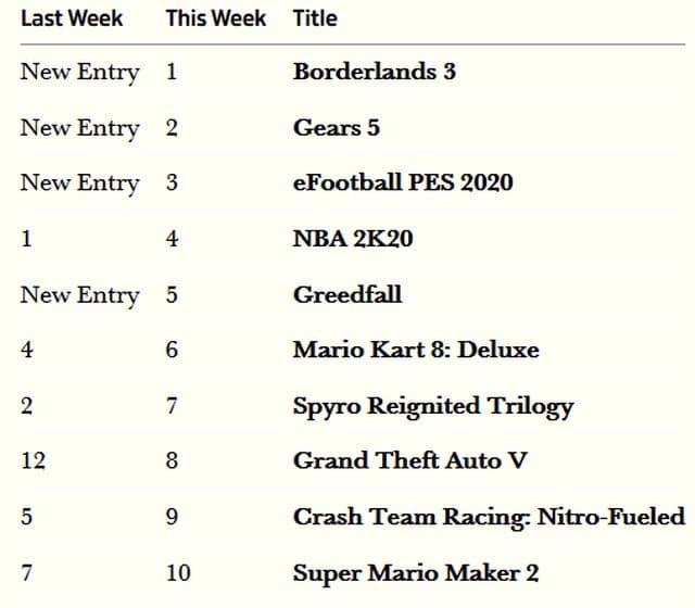 Gears 5 расположилась на втором месте, и продажи игры за первую неделю оказались на 25% ниже продаж Gears 4 за аналогичный период. Стоит отметить, что Gears 5 доступна на РС и Xbox One подписчикам сервиса Xbox Game Pass. Это могло повлиять на продажи игры.