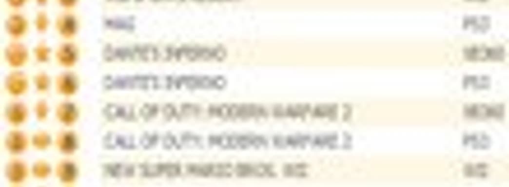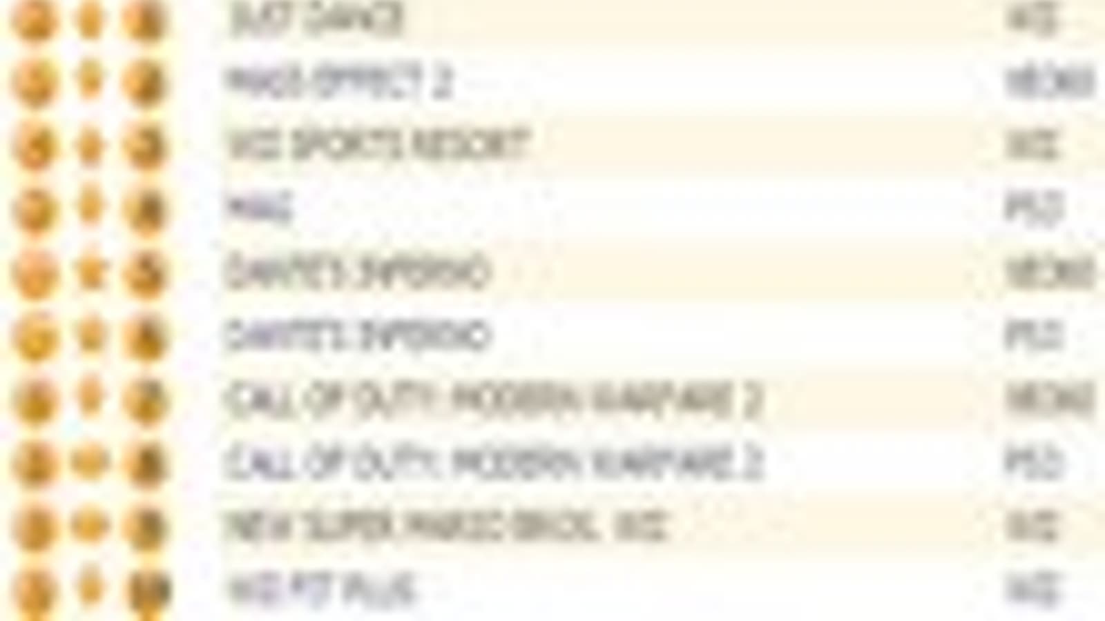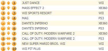 Call of Duty: Modern Warfare 2 удержался на третьей строчке (-12%). Новичок Dante's Inferno стартовал на четвертой позиции, опередив FIFA 10, которая смогла улучшить свой показатель на 26%.