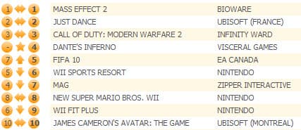 Подоспели свежие данные по продажам видеоигр на территории Соединенного Королевства. Первое место с удерживает Mass Effect 2, которая продолжает опережать танцевальную игру Just Dance в общем зачете. Однако в чарте по отдельным платформам Just Dance уже обошла Mass Effect 2 для Xbox 360.