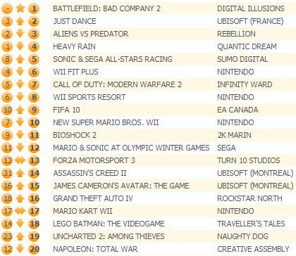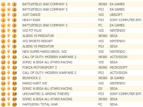 Продажи Heavy Rain обвалились на 69%, а игра переместилась на четвертое место. Aliens Vs Predator (-61%) опустился на третью строчку, а Just Dance (-15%) вернулась на вторую позицию. Продажи Sonic & Sega All-Stars Racing выросли на 28%, что позволило игре подняться с восьмого на пятого места.