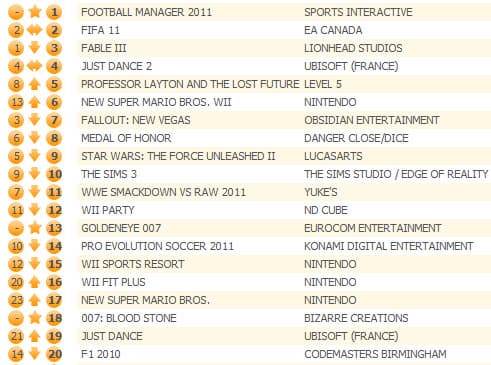Первое место занял менеджер Football Manager 2011 - этой второй РС-эксклюзив в этом году, который занял лидирующую позицию в британском чарте в этом году. Первым был StarСraft II.