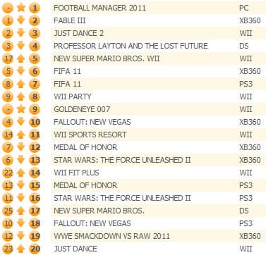 Футбольный симулятор FIFA 11 остался на второй строчке, лидер прошлой недели Fable III опустился на третье место, а четвертое все также принадлежит Just Dance 2.