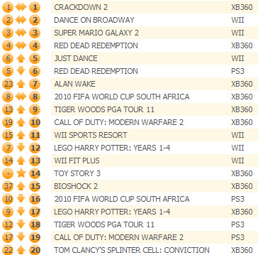 Crackdown 2 остался на первой позиции, Dance on Broadway поднялся с четвертого на второе место, отстав от лидера всего на 800 копий. Третье и четвертое места заняли, соответственно, Lego Harry Potter: Years 1-4 и Red Dead Redemption.