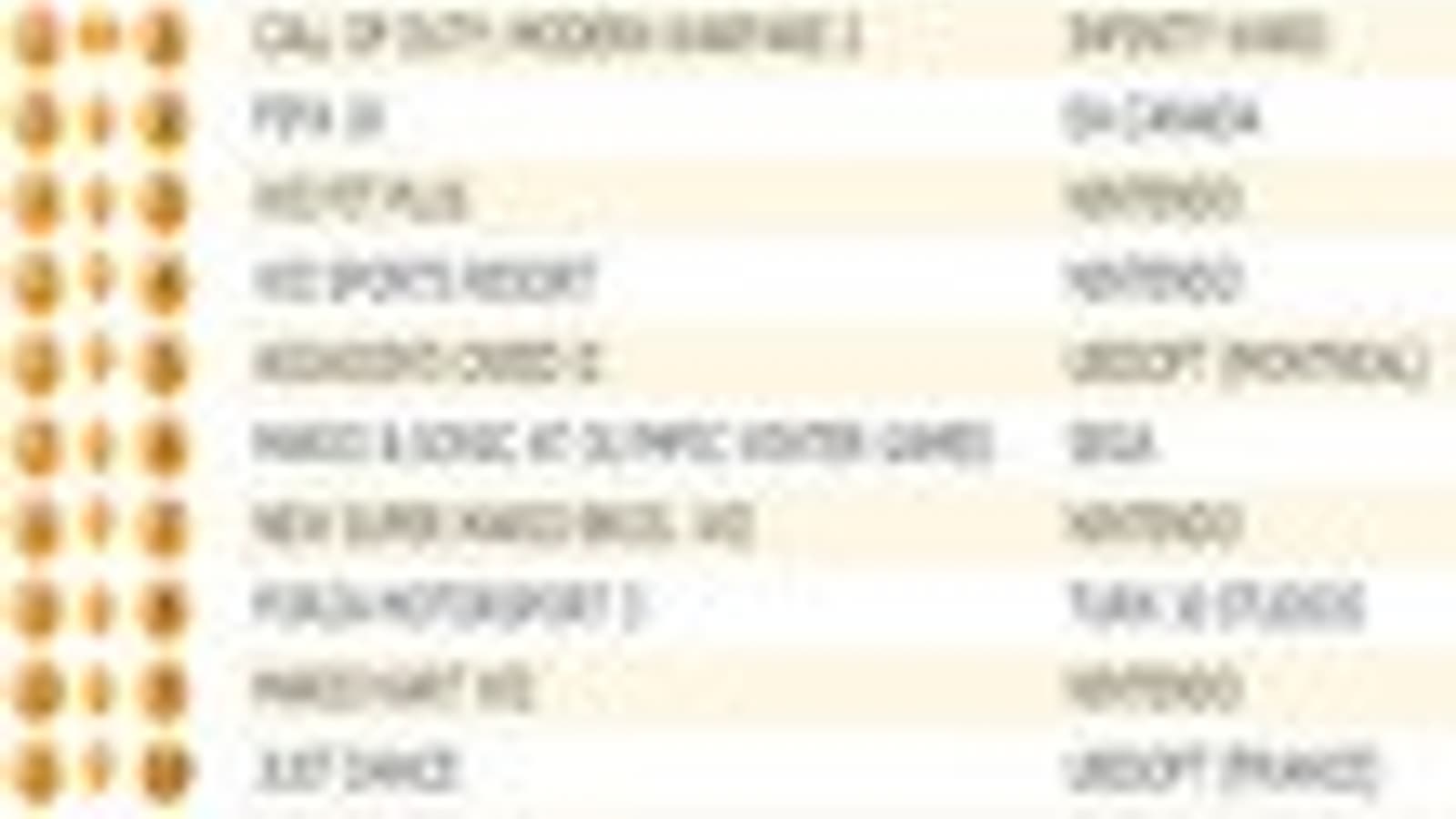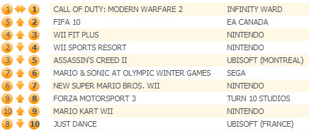 Assassin's Creed II опустилась на пятую строчку (-5%), Mario & Sonic at the Olympic Winter Games (+13%) - поднялась на шестую. New Super Mario Bros. Wii (-1%) - на седьмой, Forza Motorsport 3 (+11%) - восьмой, Mario Kart Wi (+12%) - девятой строчках хит-парада. Замыкает Top 10 Just Dance.