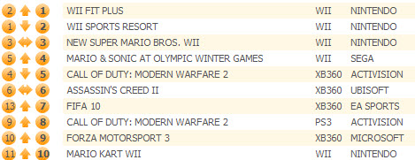 FIFA 10 ускорила свой темп на целых 24%, поднявшись на вторую позицию. Игры Nintendo занимают четыре места в первой десятке. Wii Fit Plus (+9%) и Wii Sports Resort (0%) оказались, соответственно, на третьем и четвертом местах.