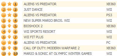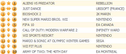 Новым лидером чарта стал шутер Aliens Vs Predator, который, несмотря на довольно невысокий средний балл (6,5/10 - по данным metacritic), продается очень хорошо. Игра пока что является самым быстро распродаваемым проектом в 2010, опередив Bioshock 2 и Mass Effect 2.