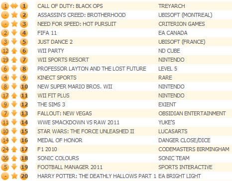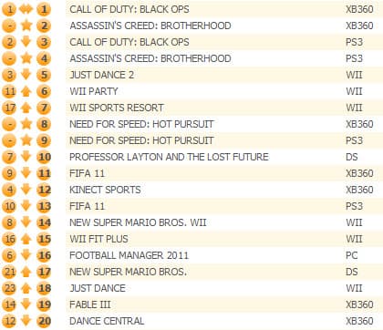 Несмотря на 85-процентное падение продаж, шутер Call of Duty: Black Ops остался на первом месте, не пропустив вперед новинки Assassin's Creed: Brotherhood и Need for Speed: Hot Pursuit, занявшие, соответственно, второе и третье места.