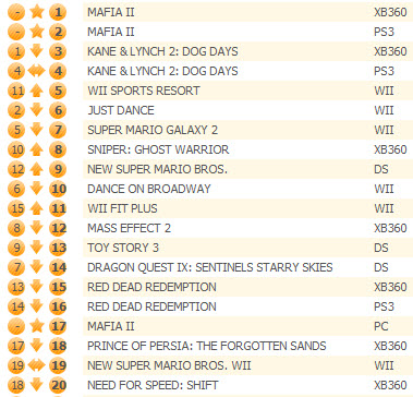 На первом месте оказался новый гангстерский экшен Mafia II, продажи по платформам разделились следующим образом: Xbox 360 - 52%, PS3 - 41%, РС - 7%.