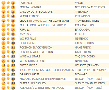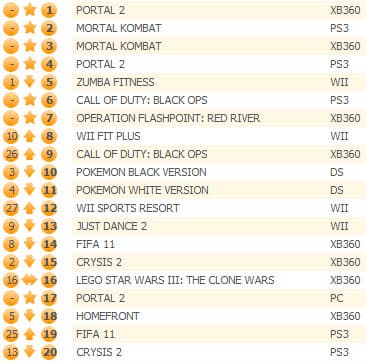 Несмотря на то, что в PS3-версии Portal 2 присутствует поддержка Steamworks и бесплатная РС-версия, новая игра от Valve продавалась лучше на Xbox 360. В индивидуальном зачете PS3-версия оказалась на четвертом месте, а РС-версия - на 17-м. Mortal Kombat активнее покупали владельцы PS3.