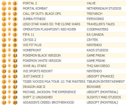 Файтинг Mortal Kombat оказался на второй строчке, а шутер Call of Duty: Black Ops после снижения цены поднялся на третью позицию. Фитнес-игра Zumba Fitness, лидировавшая две недели подряд, переместилась на четвертое место. Новый тактический шутер Operation Flashpoint: Red River занял шестое место.