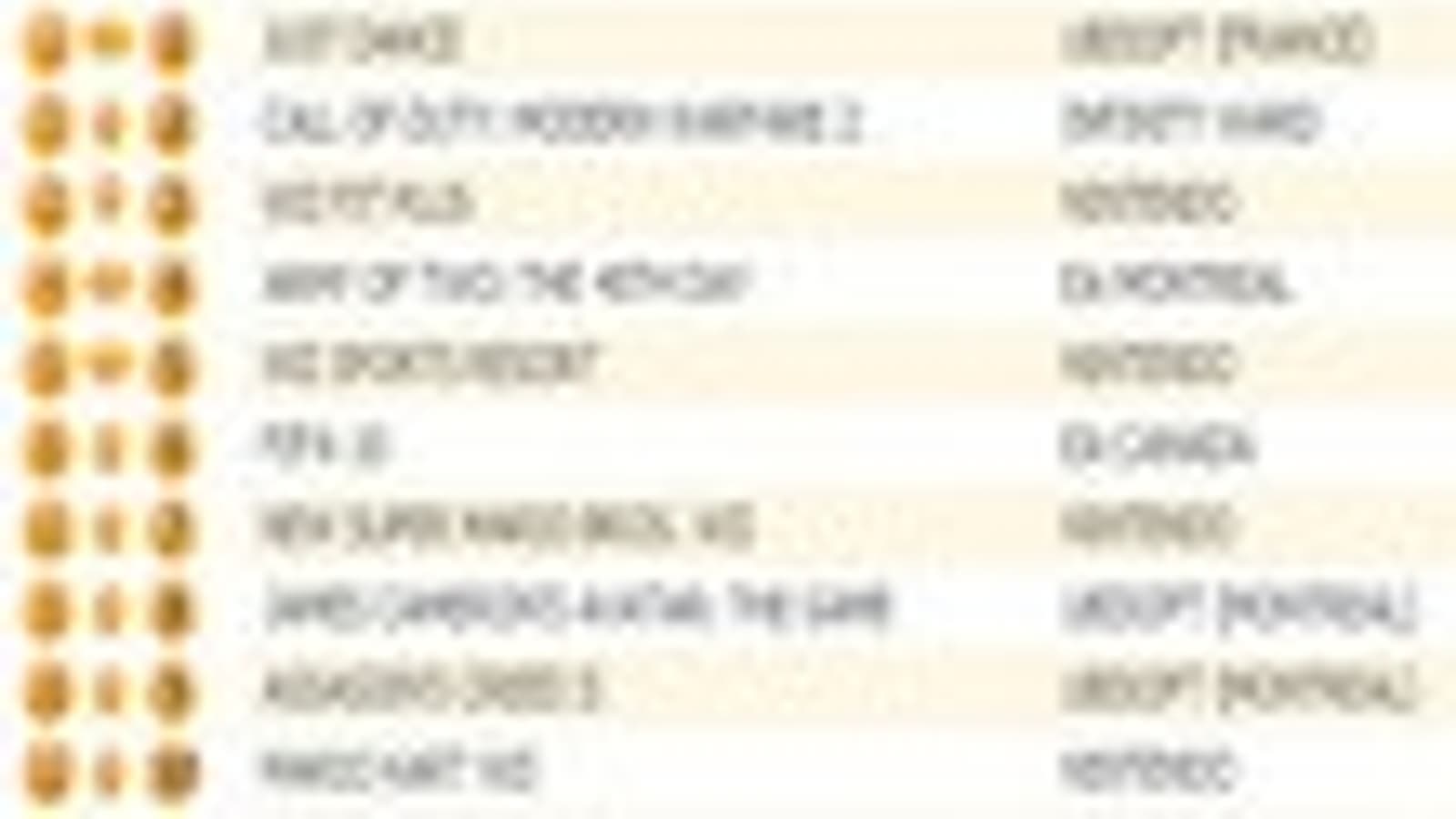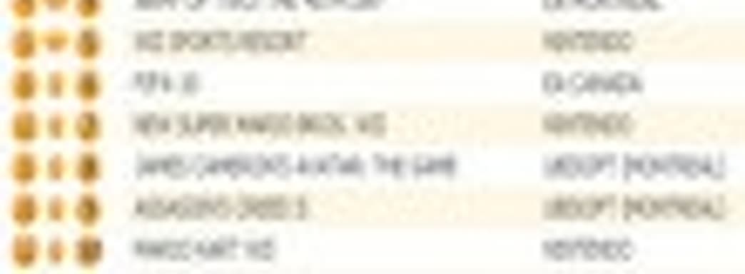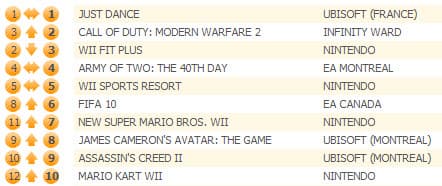 В десятку вернулись New Super Mario Bros. Wii и Mario Kart Wii, которые заняли седьмое и десятое места, соответственно. James Cameron's Avatar: The Game оказалась на восьмой строчке, Assassin's Creed II - на девятой.
