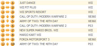 Wii Fit Plus несколько сбавила темпы продаж, пропустив на вторую строчку Call of Duty: Modern Warfare 2, сама же заняв третье место. Army of Two: The 40th Day осталась на четвертой строчке, Wii Sports Resort - на пятой. FIFA 10 поднялась на два места, заняв шестую позицию.