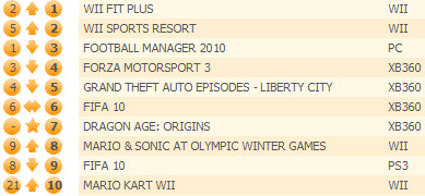 Подоспели свежие данные по продажам видеоигр на территории Соединенного Королевства. Football Manager 2010 сбавил темпы сразу на 53%, упав с первого на четвертое место.