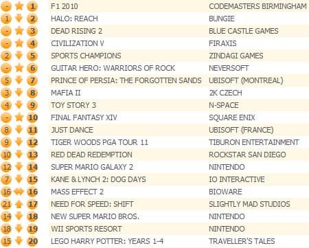 Шутер Halo: Reach смог продержаться на первом месте в британском чарте всего одну неделю, уступив лидерство симулятору королевских гонок F1 2010 от Codemasters.