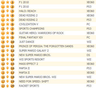 Продажи Halo: Reach снизились на 80%, впрочем Dead Rising 2 все равно не смогла подняться выше третьего места с первой попытки. Еще одна новинка Sid Meier's Civilization V, вышедшая эксклюзивно для РС, заняла четвертое место. Sports Champions для PS3 сбавил темпы на12%, опустившись на пятое место.