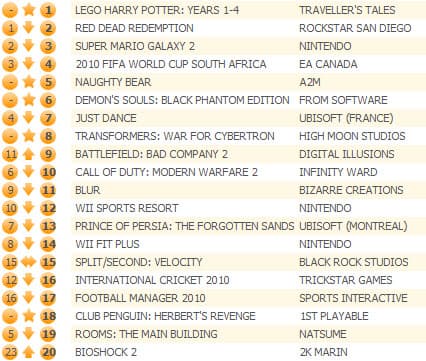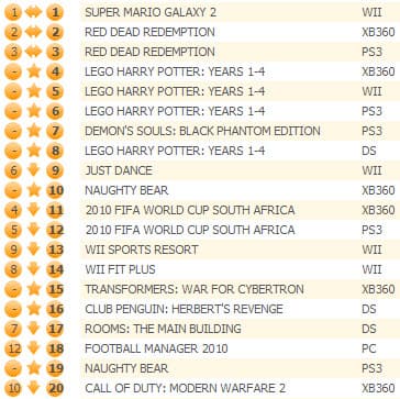 Red Dead Redemption переместилась на второе место, а Super Mario Galaxy 2 - на третье. Naughty Bear от 505 Games смогла забраться на пятую строчку, шестое же досталось изданию Demon's Souls: Black Phantom Edition, вышедшему на прошлой неделе в европейском регионе. Еще одна новинка - Transformers: War For Cybertron - занимает восьмое место. Новый шутер Singularity смог добраться лишь до 38 строчки игрового чарта.