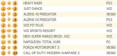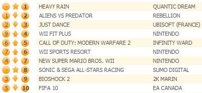 Wii Sports Resort занимает шестое место, а на седьмое опустился платформер New Super Mario Bros. Wi. Новинка Sonic & Sega All-Stars Racing смогла с первой попытки оказаться лишь на восьмой позиции, опередив Bioshock 2 и FIFA 10.