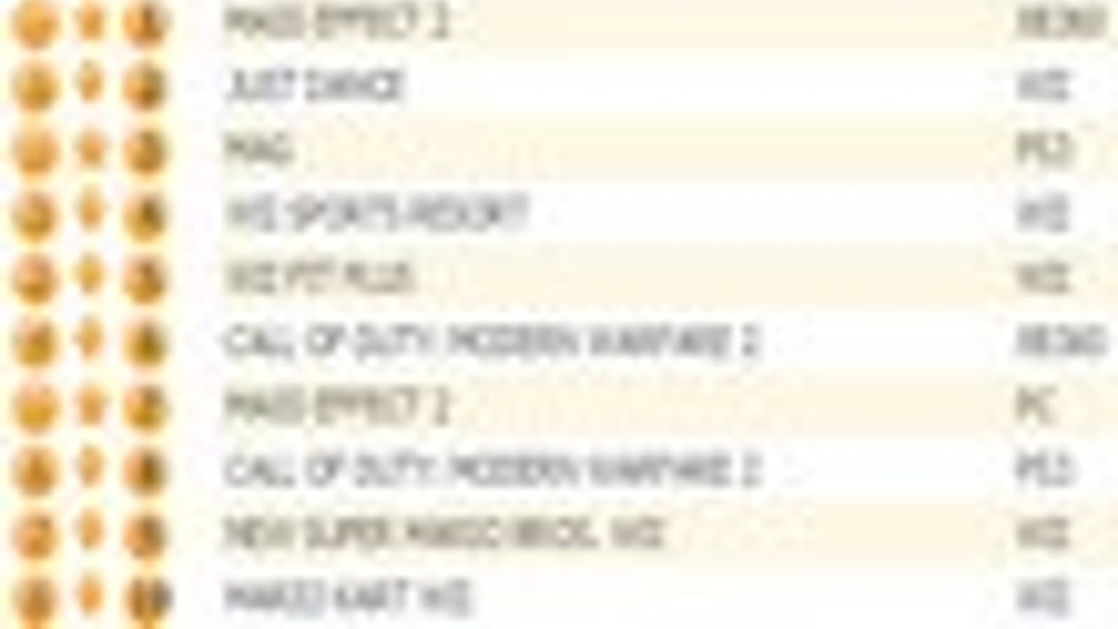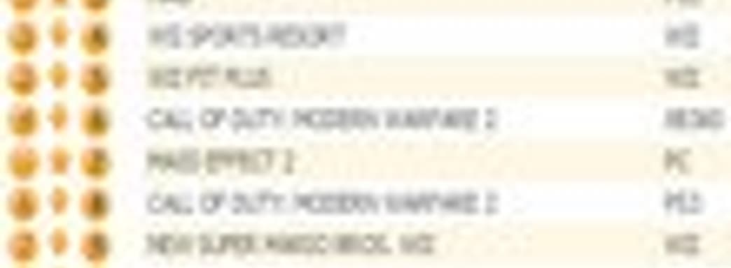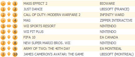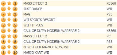 Call of Duty: Modern Warfare 2 занимает третью строчку, игра не пропустила вперед еще одну новинку прошлой недели в лице эксклюзивной для PS3 игры Massive Action Game, которая с первой попытки смогла занять лишь четвертое место. В индивидуальном зачете MAG заняла третью строчку, Mass Effect 2 для РС - седьмую.