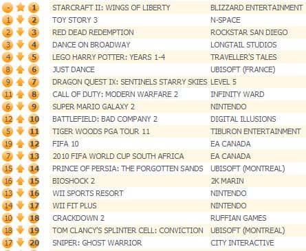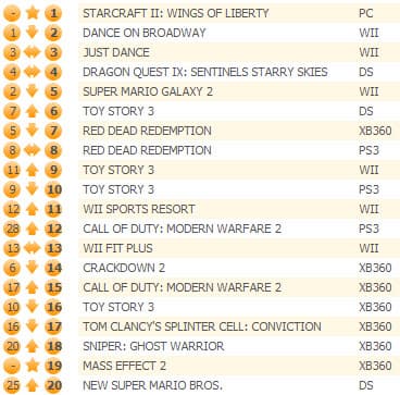 Первое место заняла стратегия в реальном времени Starcraft II: Wings of Liberty, причем Chart-Track вспоминает, как в 1998 году оригинальная Starcraft дебютировала лишь на 24-й строчке британского чарта.